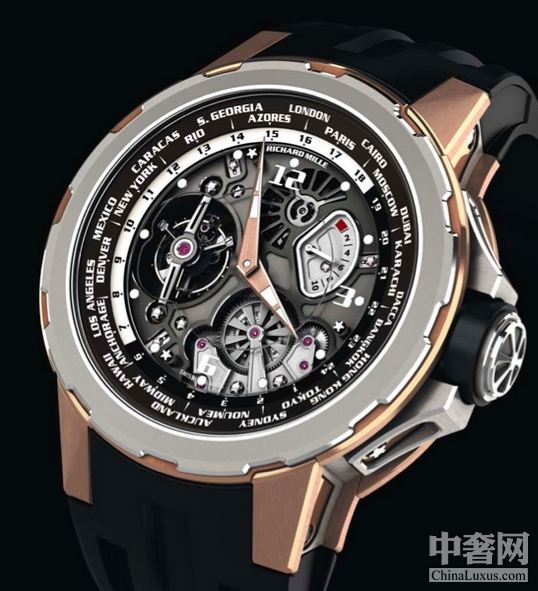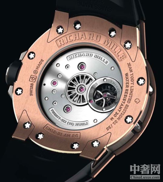 Richard Mille希望打造一枚容易使用的腕表。Richard Mille表廠眾多機(jī)芯與表殼工程師耗費(fèi)時(shí)日精心研究, 終于成就了這項(xiàng)偉大的革新之作,成功地將一個(gè)連接機(jī)芯的齒輪整合進(jìn)表圈之中,一方面讓兩個(gè)部件完美契 合,另一方面則因?yàn)闆](méi)有按鈕的設(shè)計(jì),保證了腕表整體的防水性。